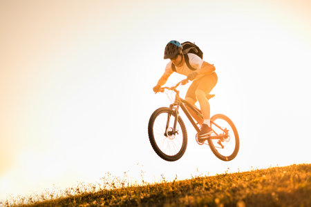 Silhouette of a cyclist riding a mountain bike in the sunset