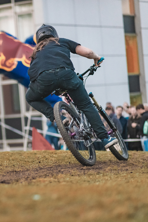 SHEFFIELD, UK - 23RD MARCH 2019: Mountain bike riders take part in the thrilling Howard Street Dual during the Outdoor City Weekender in Sheffield