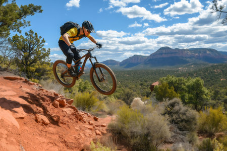 Cyclist jumping with mountain bike on a red rock trail, enjoying the scenic landscape