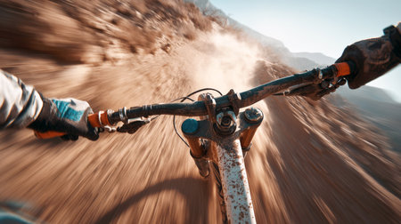 mountain biker descending a dusty trail at high speed. Intense motion blur conveys adrenaline, speed, and extreme sports. Ideal for adventure, mountain biking, downhill, mtb, and off-road activity concepts.