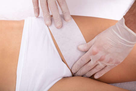 Waxing bikini area at home. Young sexy woman wearing underwear and holding strips with wax. Beauty care routine