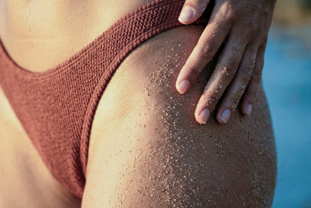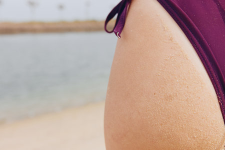 healthy fitness tanned female body bikini beach summer vacation.hips closeup hair removal and anti-cellulite massage shore sea ocean beach background.