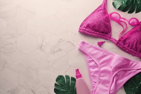 Female summer bikini swimsuit and accessories over pink background with copy space. Flat lay.