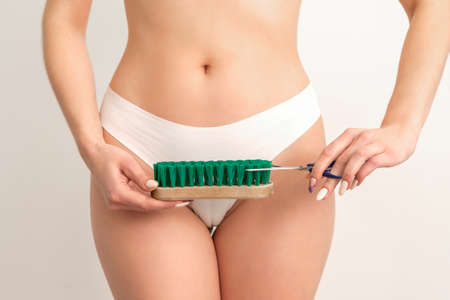 Epilation concept. A young caucasian woman wears white panties is cutting a cleaning brush with scissors standing on white background