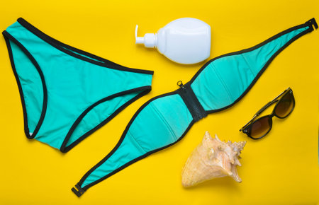 Accessories for the resort on the beach on a yellow background. Swimsuit, sunblock, sunglasses, shell. Top view.