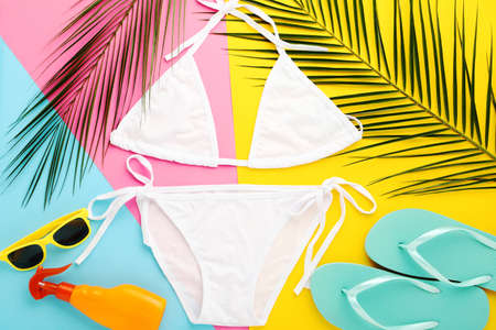 Fashion swimsuit with flip flops, palm leafs and sunglasses on colorful paper background