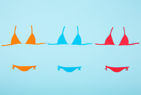 Three colorful paper bikini swimsuits on mint blue background. Minimalistic summer flat lay with negative space. Beach concept.