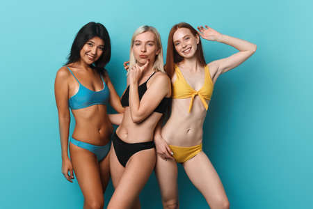 three beautiful pretty girls in stylish swimsuits posing to the camera over blue background, studio shot, grace, elegance, youth, people