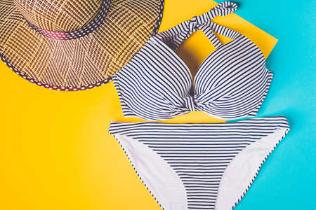 Top view of two pieces striped blue and white swimming suit and straw beach hat on blue and yellow pastel background. Concept of vacation.