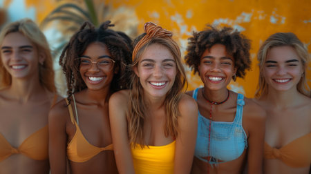 Group of diverse young female friends smiling and enjoying each other's company in beach swimwear, exemplifying happiness and friendship.