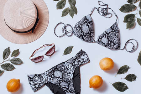 Reptile pattern black bikini, sunglasses, straw hat, lemon fruits and leaves on white. Vacation woman accessories flat lay, top view
