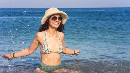 A beautiful young girl with long hair in a blue swimsuit relax on the beach in the sea in sunny hot day