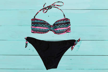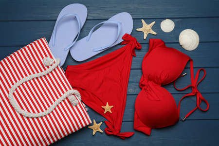swimsuit on wooden background. top view
