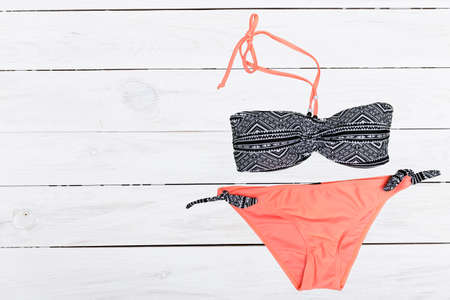 Marine beach accessories, vintage background. Swimsuit, beach items, seashells.