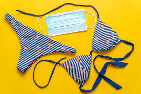 Women's swimsuit and medical mask on a yellow background. Traveling by sea during the pandemic concept