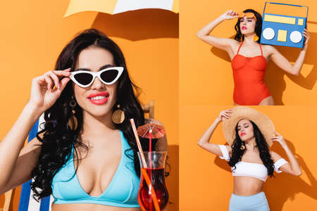 collage of girl in sunglasses holding cocktail and paper cut boombox while touching straw hat on orange