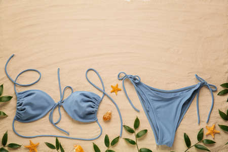 Stylish bikini, starfishes, shells and leaves on sand, flat lay. Space for text