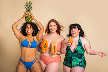 Group of 3 oversize women posing in studio - Beautiful girls accepting body imperfection, beauty shots in studio - Concepts about body acceptance, body positivity and diversity