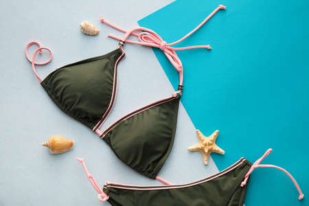 Woman swimwear and beach accessories flat lay top view on colored background Summer travel concept. bikini swimsuit, straw hat and seasheels. Copy space top view.