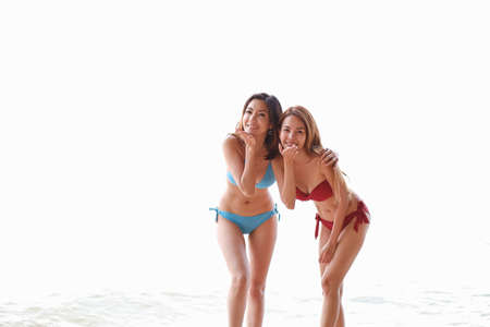 Happy girlfriends in bikinis enjoying summer holidays on beach