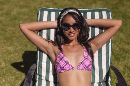 Mixed race woman wearing sunglasses sunbathing on sunbed in garden. Hanging out and relaxing outdoors in summer.