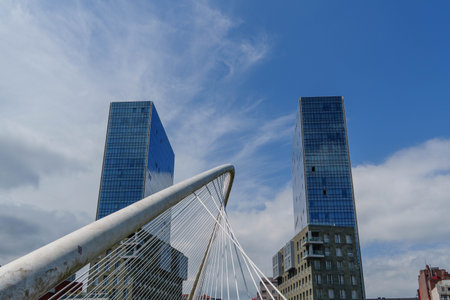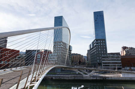 Bilbao, Spain, January 1, 2012. White Bridge on the River Nervión Pendant, designed by architect Santiago Calatrava and Isozaki twin towers designed by Japanese architect Arata Isozaki in collaboration with the architect Iñaki Aurrekoetxea Bilbao, designe