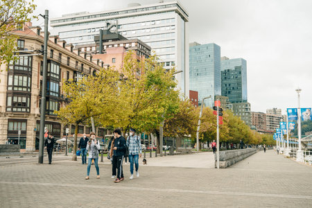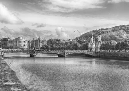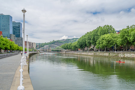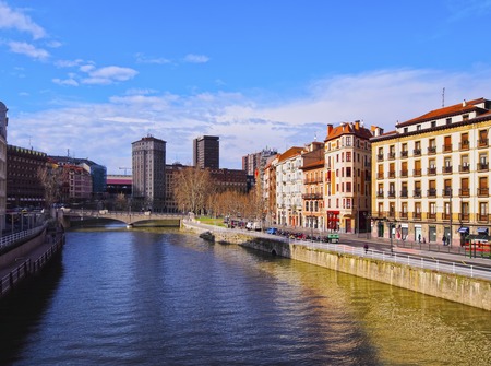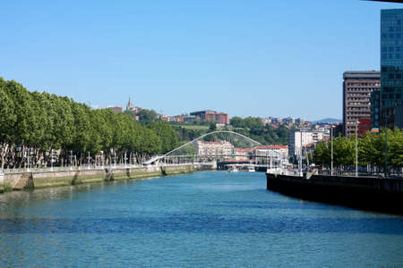 Nervion River embankment in the centre of Bilbao, largest city in the Basque Country in northern Spain