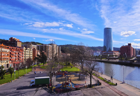 Bilbao, Spain, February 15, 2022. Modern buildings on the banks of the Nervion river in Bilbao, Spain.