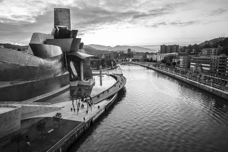 Bilbao, Spain - January 29, 2016: black and white night view of modern and contemporary art Guggenheim Museum, designed by American architect Frank Gehry and inaugurated in October 1997.