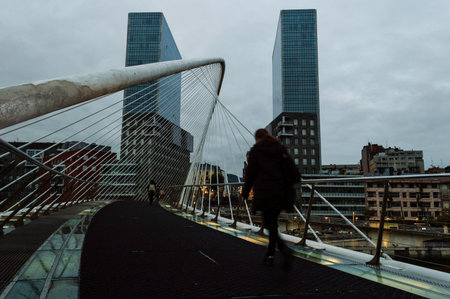 View of a Zubizuri bridge over the Nervion River, with pedestrians walking on their way to their jobs in a cloud day, between the towers of Bilbao, Vizcaya, Spain.