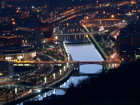 Aerial view of Bilbao, Spain city downtown with a Nevion River at Night