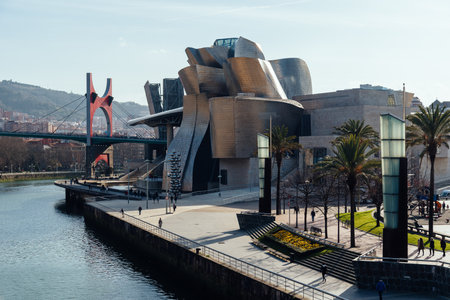 Guggenheim Museum Bilbao showcasing its modern deconstructivism titanium architecture by Frank Gehry, with urban buildings and a clear skyline in the background. Bilbao Spain October 20th 2025