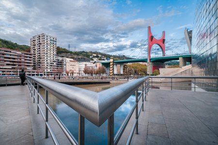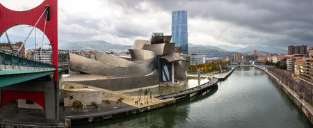 Bilbao, Spain - NOV 21, 2021: panoramic view of The Guggenheim Museum designed by Frank Gehry and embankment Estuary of Bilbao in the rainy day