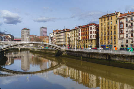 Bilbao, Spain, February 15, 2022. Typical buildings on the banks of the Nervion river in Bilbao, Spain.