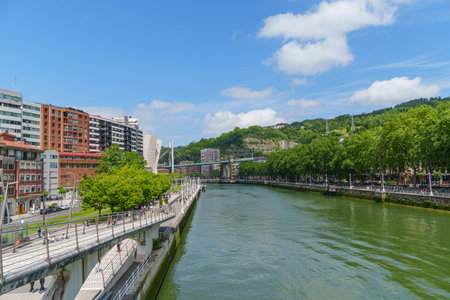 Bilbao, Spain - 08.06.2022: View city of Bilbao, Nervion river and its colorful architecture. Apartment buildings along the Nervion River, Bilbao, Spain.