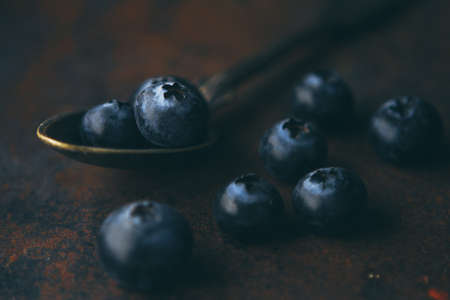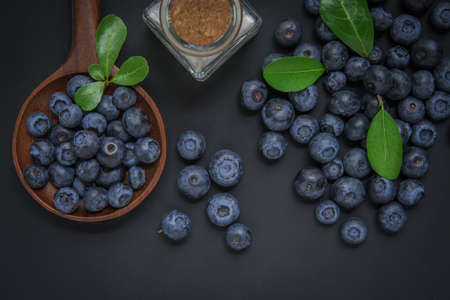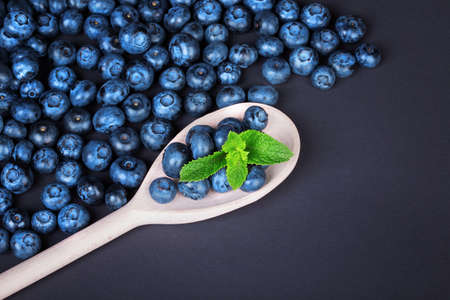 A wooden spoon filled with juicy and bitter blueberries and a leaf of mint on a dark background. Fresh and ripe bright blue berries around a spoon, top view. Summer fruits from garden.