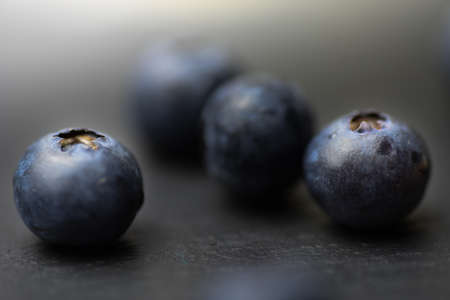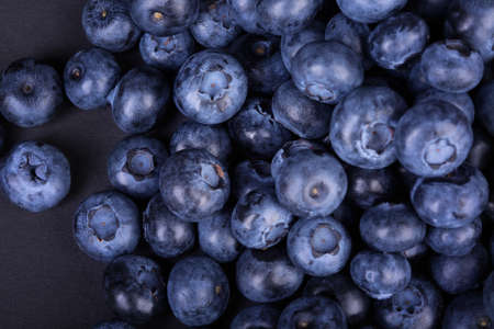 A macro picture of dark purple blueberries on a black background. Delicious and raw blueberries full of nutrients. Ingredients for light summer snacks. A group of freshly picked blueberries.
