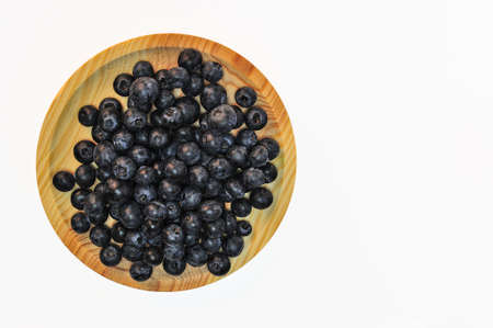 Against the background of a brown wooden wall is a light wooden bowl of fresh blueberries, a housewife from the buyout will make jam