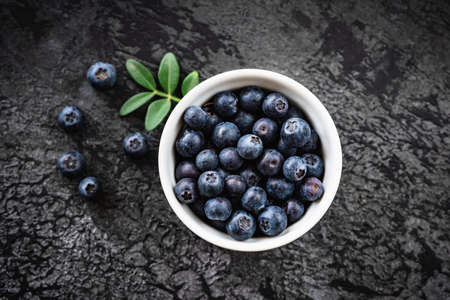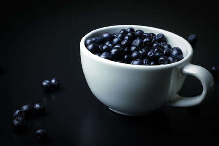 Blueberry in white cup on the black background. Fruit from forest. Popular healthy snack.