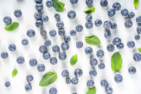 Freshly picked juicy blueberries background, flat lay. blueberry texture. Concept of healthy nutrition, organic food. Vegan and vegetarian