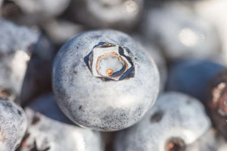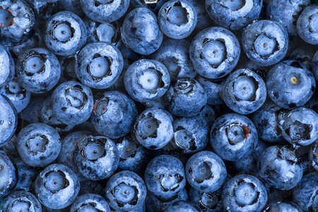 Blue round berries background close up. Blueberries or Vaccinium corymbosum are widely cultivated by gardeners across the United States. Fruit and juice. Summer harvest. Natural food. Eco market.