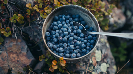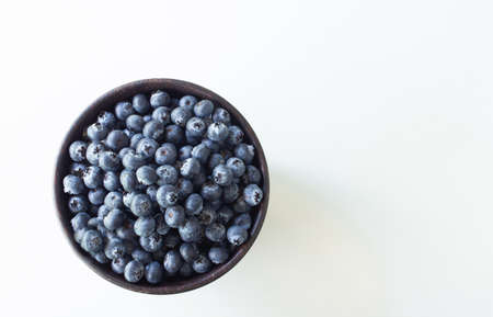 Tinted photo of fresh blueberry in a white cup, top view, with a copy space