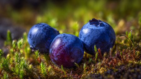 Three vibrant wild blueberries nestled on mossy forest floor in bright sunshine