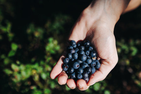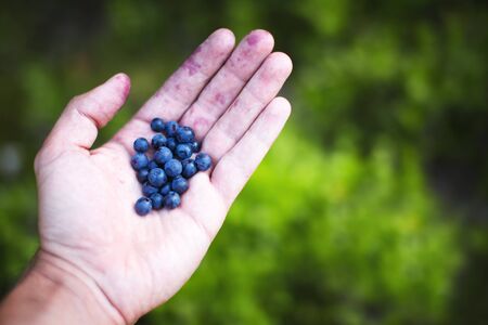 woman collects organic blueberries in the forest. female hands collect blueberries in the summer forest. Womens hands stained with blueberries.