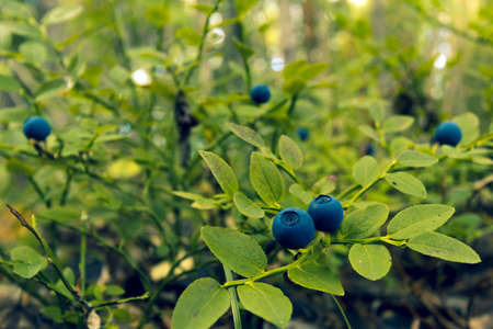 Berries of blueberries growing on a bush with small green leaves in the wild