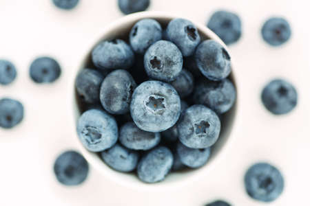 Heap of fresh ripe blueberries in a white ceramic bowl on a white background, top view, shallow depth of field, macro shot