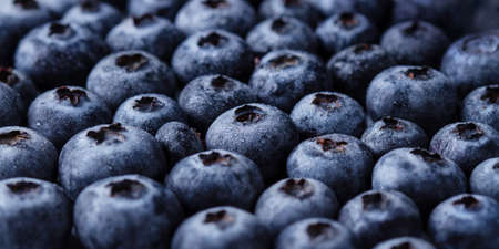 Blueberries covered by water drops. Macro photography of fresh blueberries. Ripe blueberries background. Blueberries texture. Food photography collection.