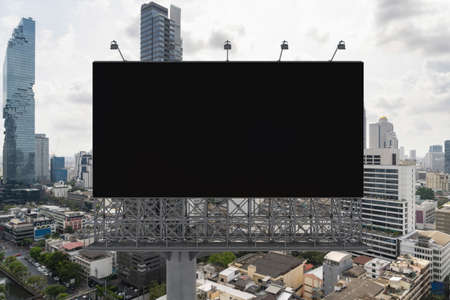 Blank black road billboard with Bangkok cityscape background at day time. Street advertising poster, mock up, 3D rendering. Front view. The concept of marketing communication to promote or sell idea.