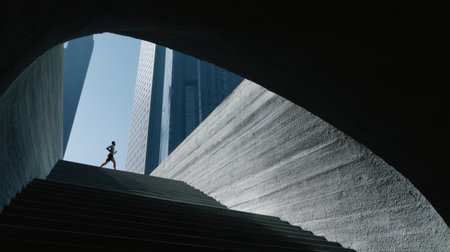 A powerful silhouette of a runner on sculptural stairs creates a dynamic scene against a dramatic urban skyline, capturing the essence of energy and movement in the city.