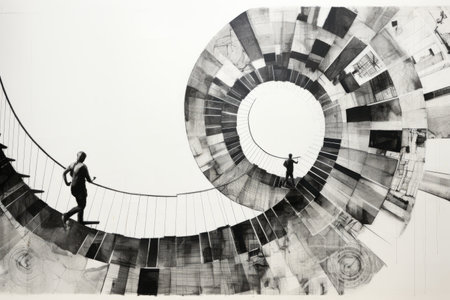 Ascending to Success: Dynamic Vertical Collage Depicting a Running Figure, Black and White Palette, Dramatic Hand-Drawn Target, and Towering Stairs